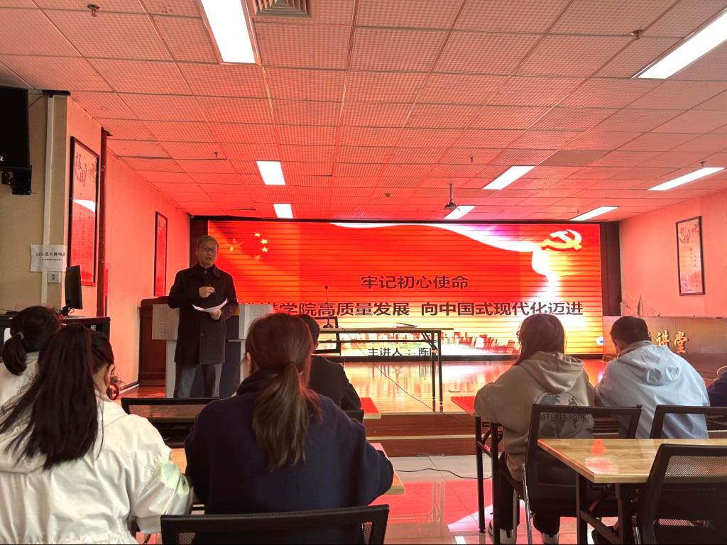 课上,陈刚同志围绕党课主题讲了共产党人的初心与使命,坚持人民至上、践行为民宗旨,以高质量发展推进中国式现代化,如何推进学院高质量发展四个部分内容。中国共产党一经诞生,就把为中国人民谋幸福、为中华民族谋复兴确立为自己的初心使命。一百年来,中国共产党团结带领中国人民进行的一切奋斗、一切牺牲、一切创造,归结起来就是一个主题:实现中华民族伟大复兴。建设教育强国,是全面建成社会主义现代化强国的战略先导,是实现高水平科技自立自强的重要支撑,是促进全体人民共同富裕的有效途径,是以中国式现代化全面推进中华民族伟大复兴的基础工程。