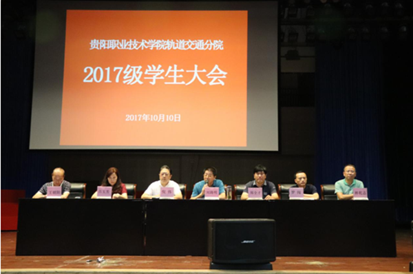 2017年10月10日,轨道交通分院在学院大礼堂召开2017级新生学生大会。参加此次大会的有:学院党委委员、副院长、轨道交通分院院长刘路明,分院党总支书记郑全才,常务副院长倪伟、副院长罗闯、吕玉芳,学生管理办公室主任林乾志、教学管理办主任王朝阳,以及2017级各班辅导员。