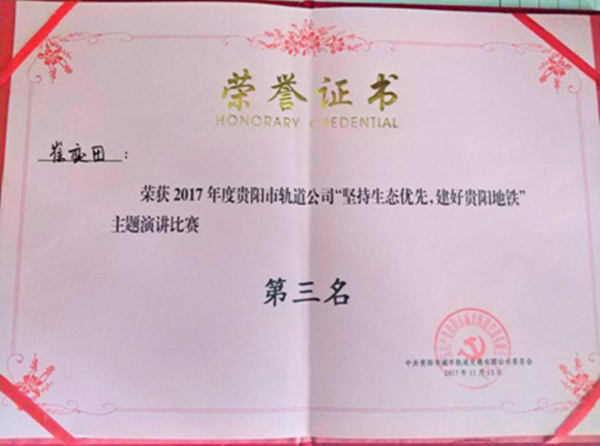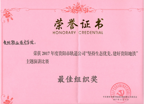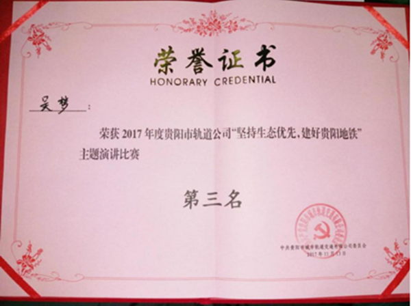 2017年11月13日,贵阳市城市轨道交通有限公司党委主办的“坚持生态优先 建好贵阳地铁”主题演讲比赛在贵阳轨道公司举行。贵阳职业技术学院轨道交通分院2015级城市轨道交通运营管理订单班吴梦、崔奕田两名同学参加了此次比赛。