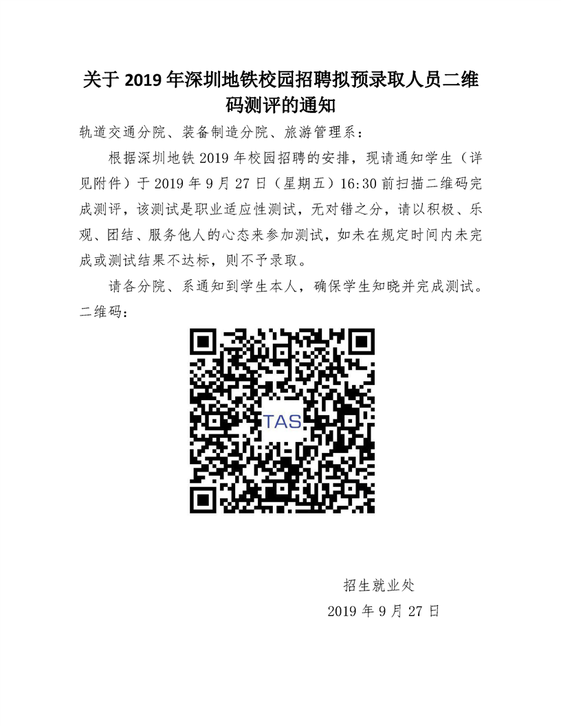 关于2019年深圳地铁校园招聘拟预录取人员二维码测评的通知