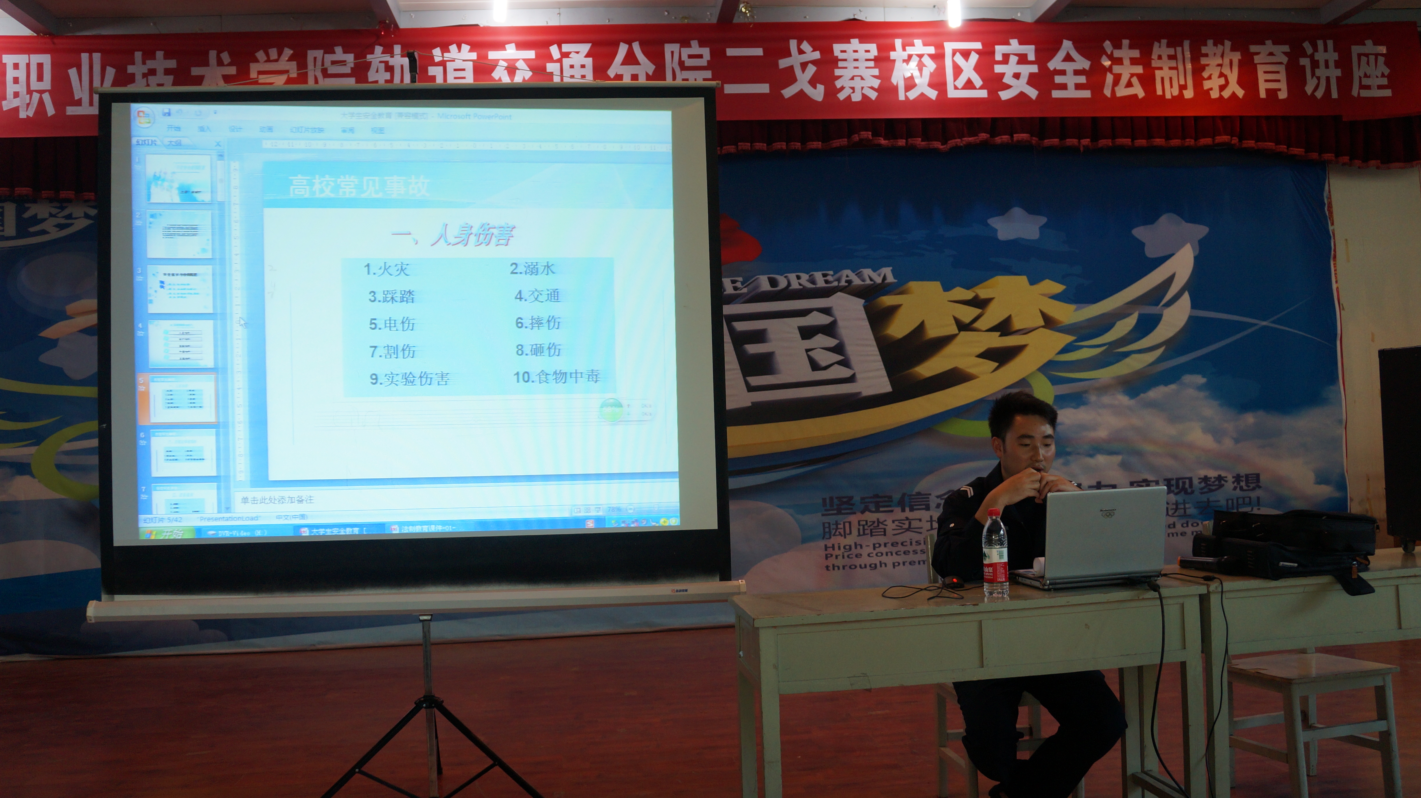 为进一步做好学生安全保卫工作,增强学生安全法制意识,2015年10月27日至29日,轨道交通分院二戈寨校区邀请辖区二戈寨派出所胡鹏宇警官在校区礼堂为校区在校学生进行了安全法制教育宣讲。