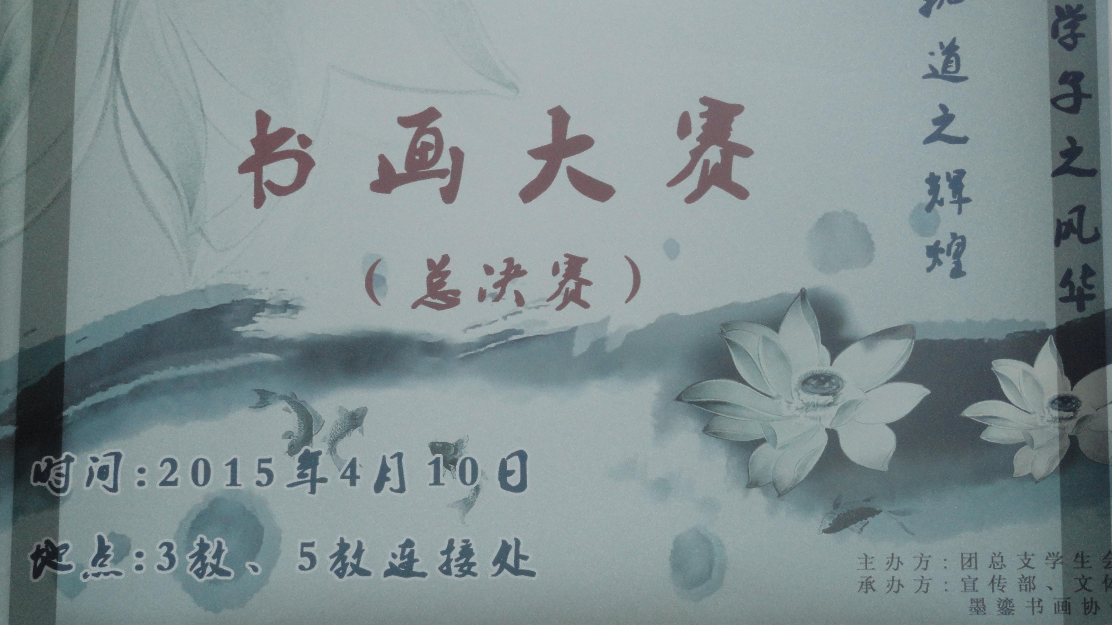 为了丰富校园文化生活,营造浓厚的校园文化氛围,激发学生的美术及书法的兴趣与爱好,丰富大学生课余生活,提高学生的艺术修养、审美情趣。让书画艺术永久传承,同时也为书画爱好者提供展现自我价值的平台,促进书画爱好者之间的交流。2015年4月10日下午2时,轨道交通分院墨鎏书画协会在3教与5教连接处举办了以“书学子之风华,画轨道之辉煌”为主题的首届校园书画大赛总决赛。