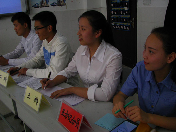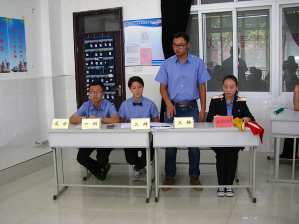 接着举行了以“职业心态”为主题的辩论。辩论团队,正方由一辩(何子晗)、二辩(温远博)、三辩(王程叶子),反方由一辩(李鹏)、二辩(柳程莽)、三辩(陈榕飞)组成。正反方以“工作心态”和“工作能力”谁更重要为辩题,进行了精彩纷呈的辩论。