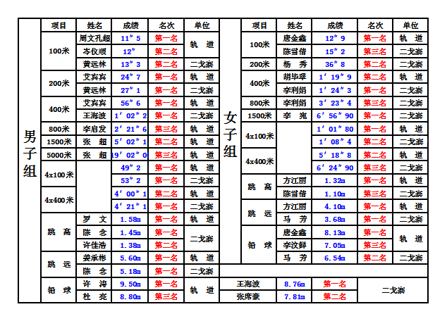 男子组4X400米团体第二名 女子组4X100米团体第二名