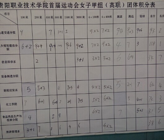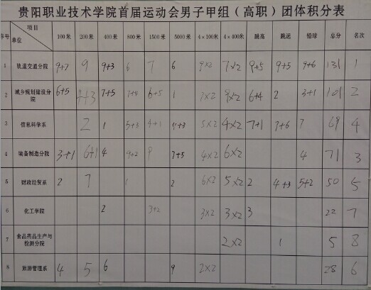 2014 年11月15日下午,贵阳职业技术学院为期两天的首届校运会在体育场上胜利闭幕。轨道交通分院26名男女运动员参加了比赛,取得了男子甲组团体第一名和女子甲组团体第二名好成绩。