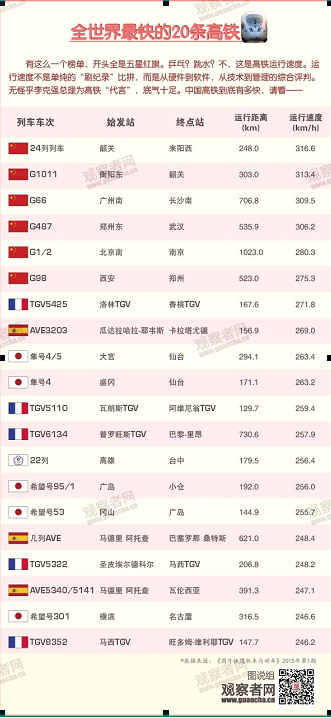 中国是世界上高速铁路系统技术最全、建设规模最大、集成能力最强、运营里程最长、运行速度最高的国家。想知道中国高铁有多快?最权威的数据在这里。下图中,左侧数字表示运行速度,右侧数字及条形图表示运行距离。