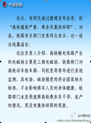 【谣言一】最先冒出来的一个帖子说:高铁尽量不要坐,高铁乘务员最近又招了一批,因为上一批集体辞职了,因为高铁辐射严重,乘务员不是不孕就是流产,因为引进的只是高铁机芯,而车厢和防辐射设备根本没有!因为一块半米的防辐射玻璃要三万块,他们省到了自己腰包,而百姓却要深受其害!