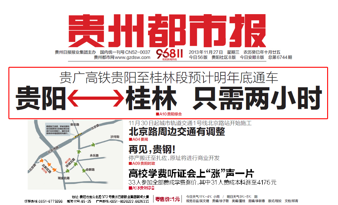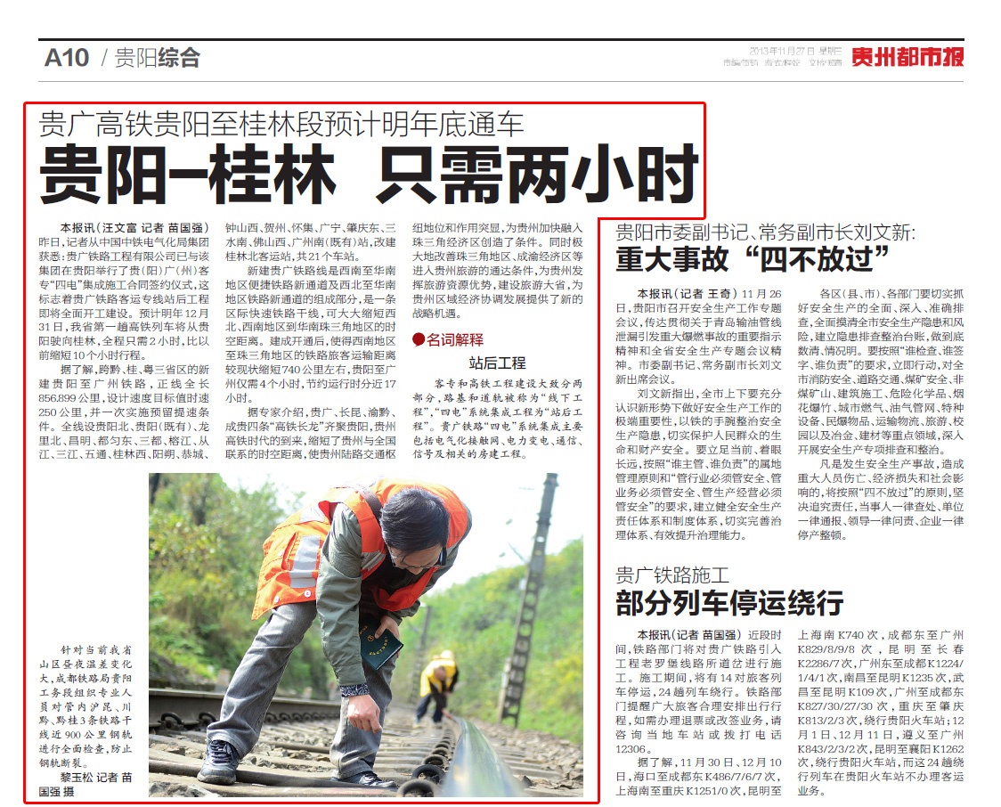 昨日,记者从中国中铁电气化局集团获悉:贵广铁路工程有限公司已与该集团在贵阳举行了贵(阳)广(州)客专“四电”集成施工合同签约仪式,这标志着贵广铁路客运专线站后工程即将全面开工建设。预计明年12月31日,我省第一趟高铁列车将从贵阳驶向桂林,全程只需2小时,比以前缩短10个小时行程。