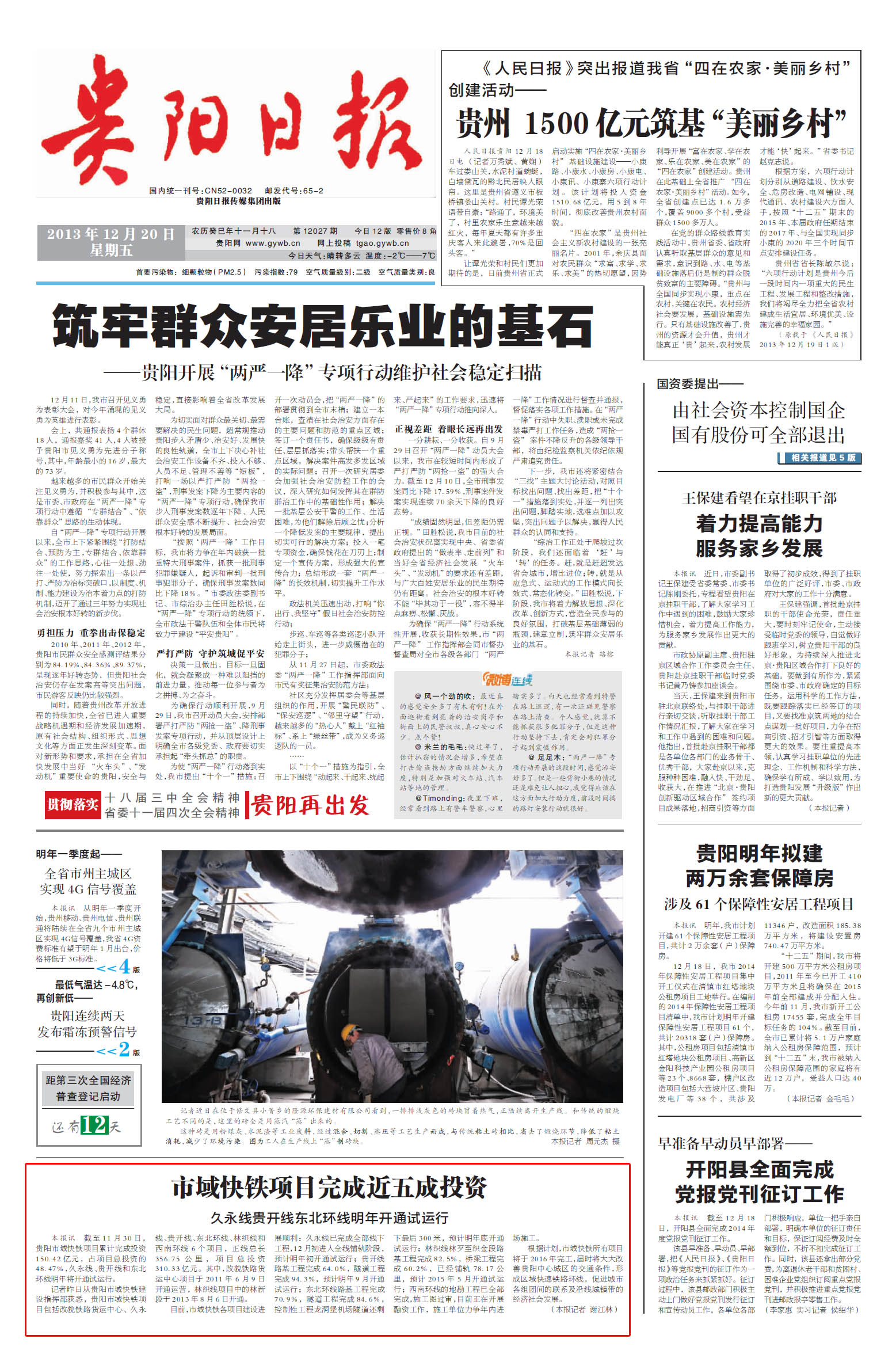 本报讯 截至11月30日,贵阳市域快铁项目累计完成投资150.42亿元,占项目总投资的48.47%,久永线、贵开线和东北环线明年将开通试运行。
