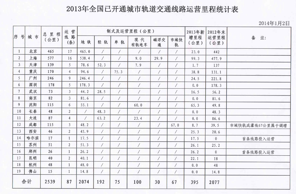 2013年末,我国累计有19个城市建成投运城轨线路87条,运营里程2539公里。其中,成都市的成灌线67公里市域快轨,2010年建成投运,原先未计入统计,这次纳入统计属调增情况。因而,2013年实际新增2个运营城市、16条运营线路、395公里运营里程。在2539公里运营里程中,地铁2074公里,占总里程的81.7%;轻轨192公里,占总里程的7.6%;单轨75公里,占总里程的3.0%;现代有轨电车100公里,占总里程的3.9%;磁浮交通30公里,占总里程的1.2%;市域快轨67公里,占总里程的2.6%。