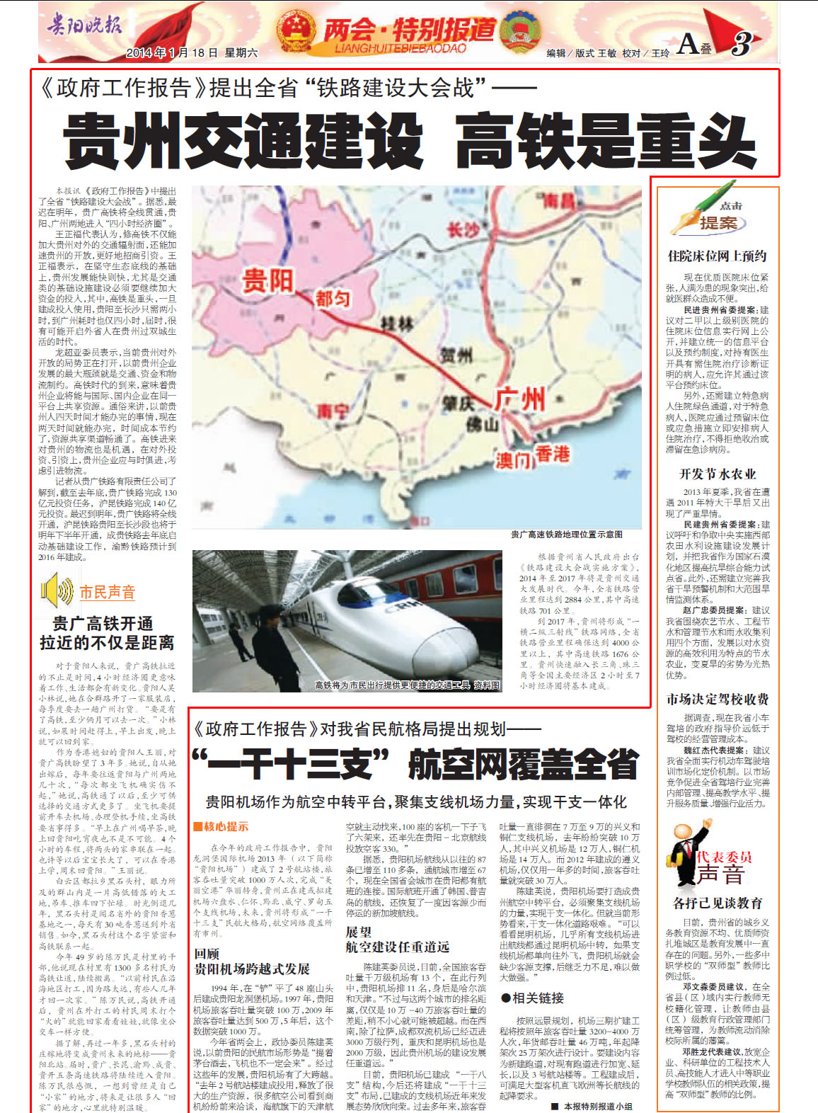 《政府工作报告》中提出了全省“铁路建设大会战”。据悉,最迟在明年,贵广高铁将全线贯通,贵阳、广州两地进入“四小时经济圈”。