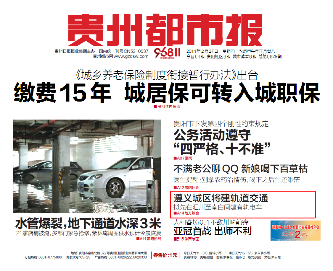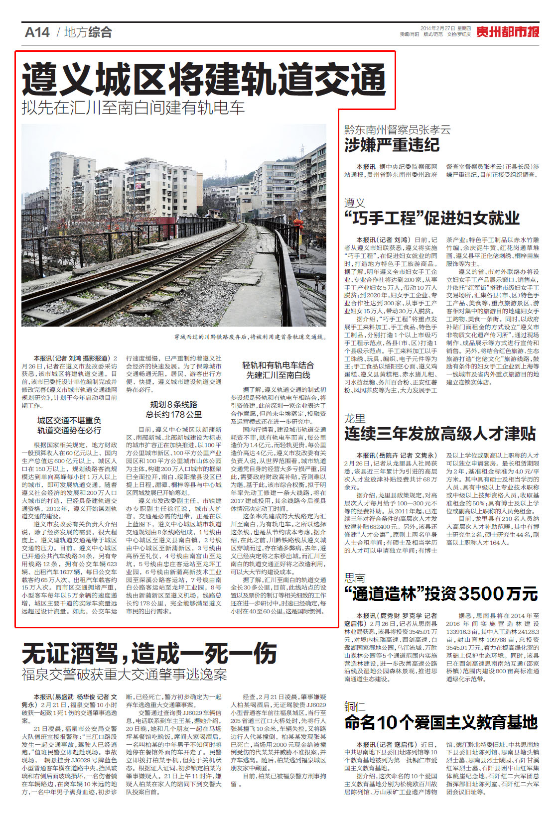 2月26日,记者在遵义市发改委采访获悉,该市城区将建轨道交通。目前,该市已委托设计单位编制完成并修改完善《遵义市城市轨道交通线网规划研究》,计划于今年启动项目前期工作。
