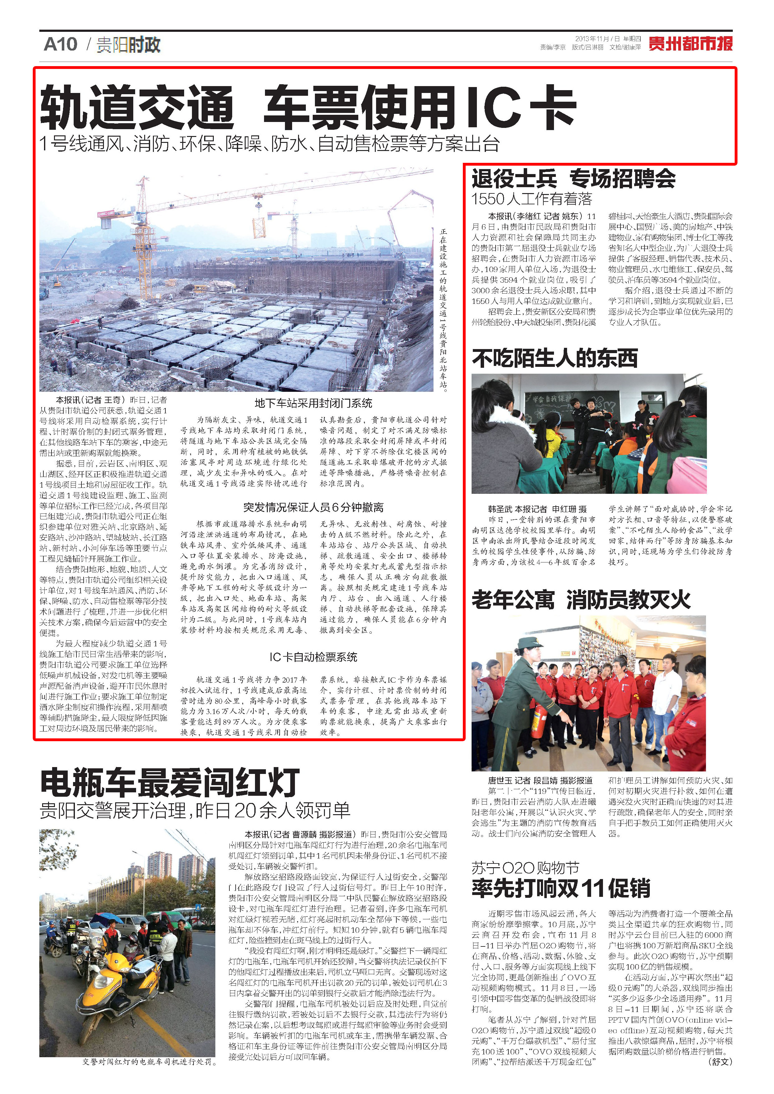 为最大程度减少轨道交通1号线施工给市民日常生活带来的影响,贵阳市轨道公司要求施工单位选择低噪声机械设备,对发电机等主要噪声源配备消声设备,避开市民休息时间进行施工作业;要求施工单位制定洒水降尘制度和操作流程,采用湿喷等辅助措施降尘,最大限度降低因施工对周边环境及居民带来的影响。