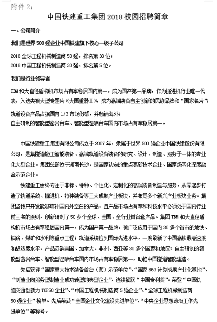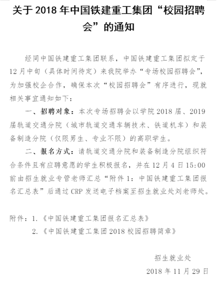关于2018年中国铁建重工集团“校园招聘会”的通知