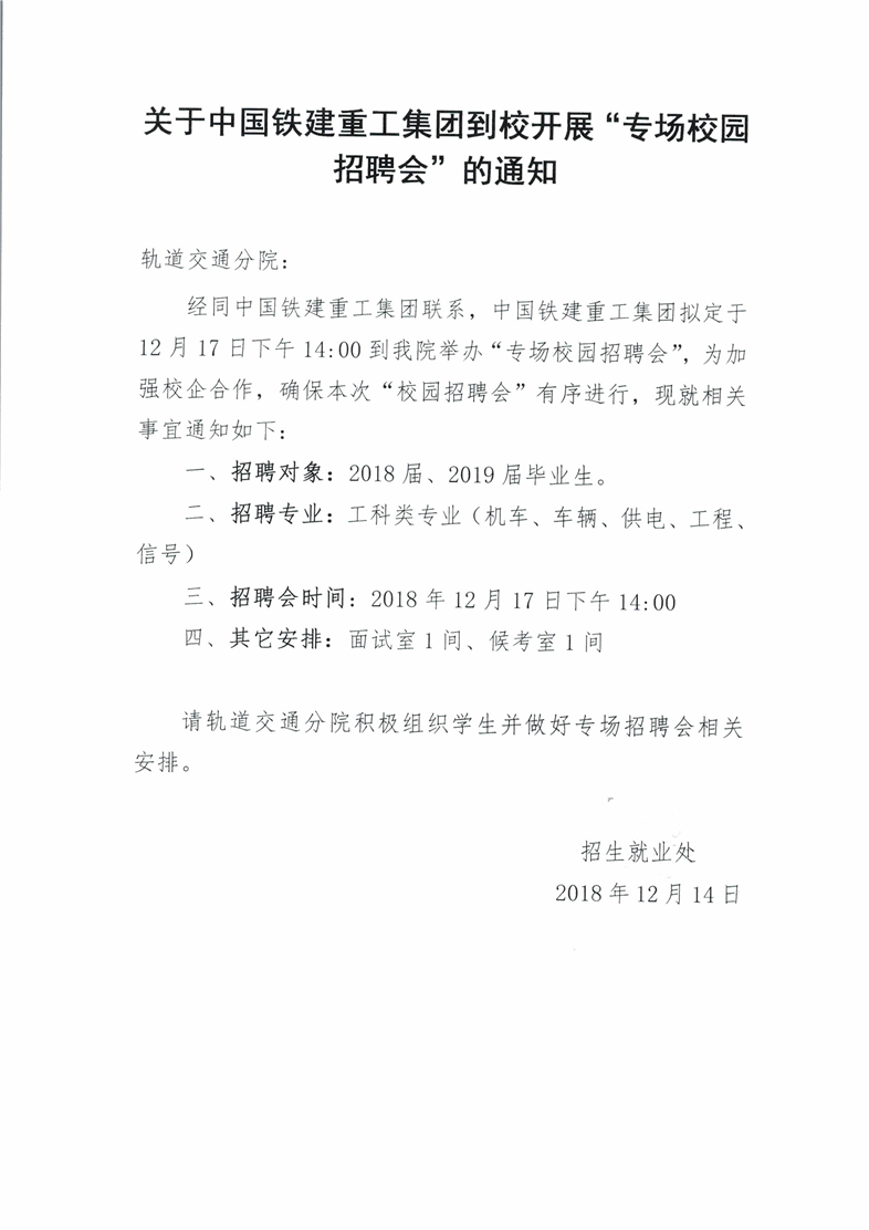 关于中国铁建重工集团到校开展“专场校园招聘会”的通知