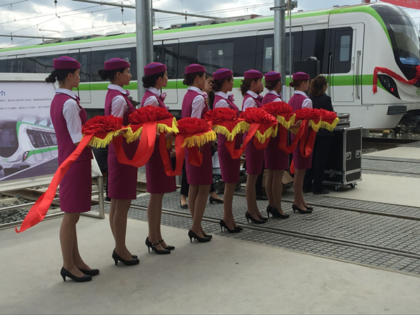 图为礼仪学生与首列电客车车头合影