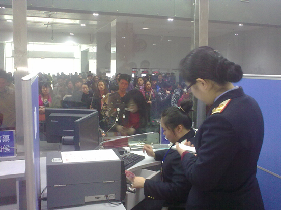 在贵阳车站售票窗口实习学生在师傅指导下进行售票实操训练