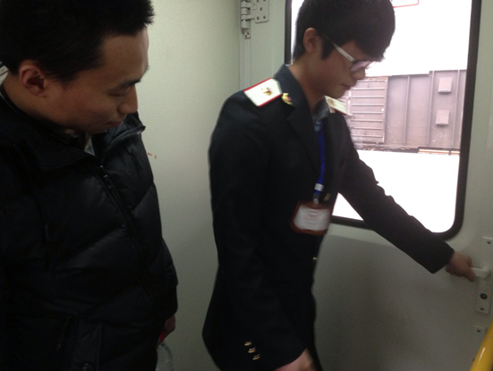 学生王静跟车实习在师傅指导下练习开关车门工作