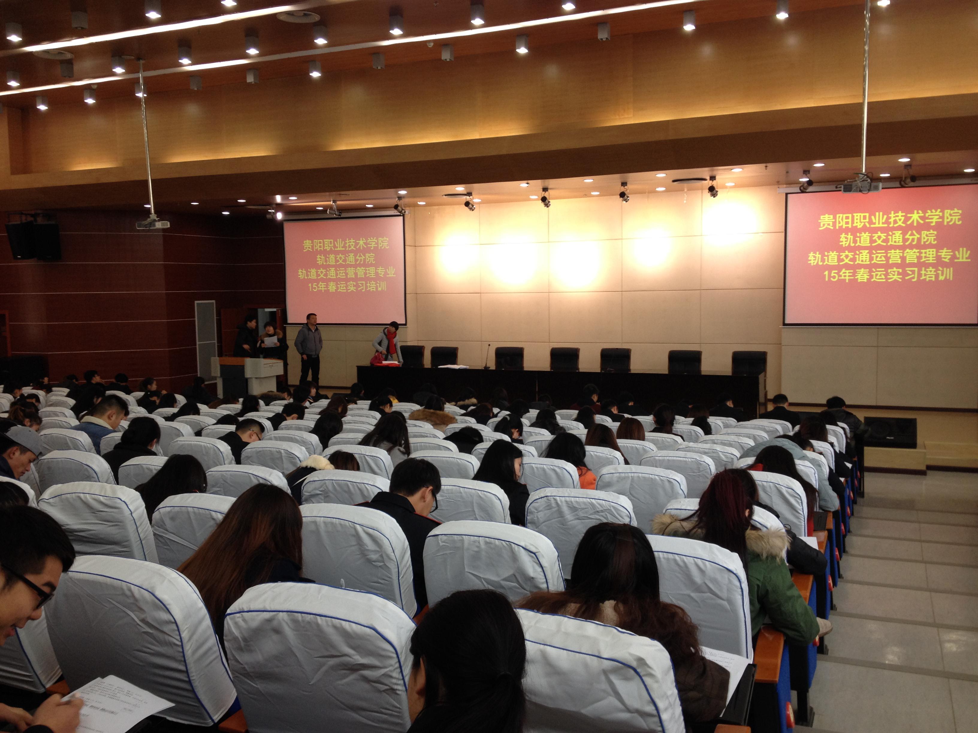 2014年12月24日,轨道交通分院2013级轨道交通运营管理专业及11专运营专业共287名同学在图书馆学术报告厅举行专业实习安全培训,为西南第一条高速铁路——贵广高铁26日的开通和2015年铁路春运做充分准备。轨道交通分院全力支持并高度重视此次专业实习,分院倪伟常务副院长在培训之前做实习动员,要求实习学生要牢固树立职业意识、安全意识和服务意识。贵阳车站派出职教科老师、客运车间和售票车间工作能手来为参加实习学生进行安全和车间管理制度的培训。