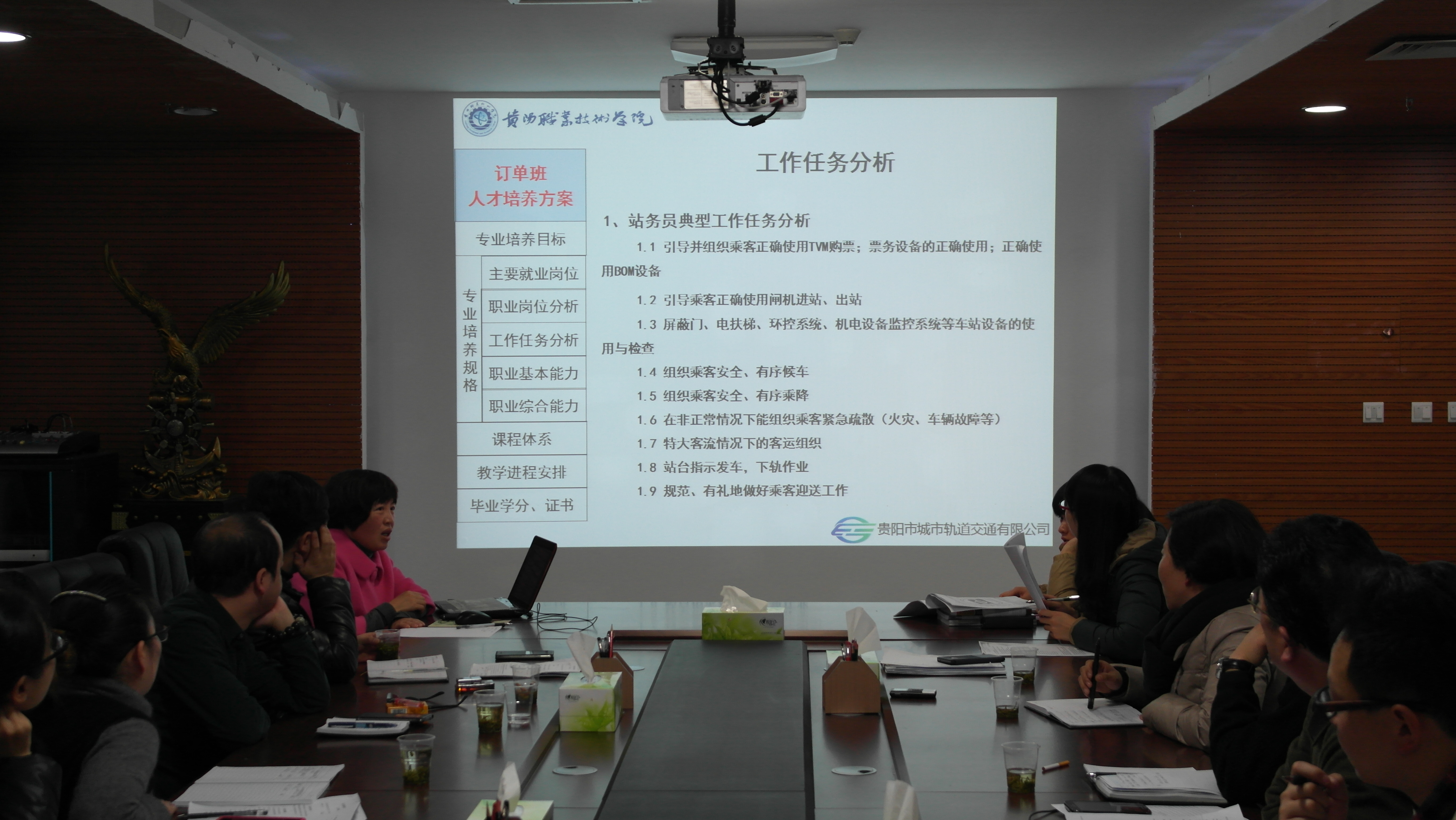 研讨会上,双方就2013级贵阳轨道交通订单班两个专业、三个方向的人才培养方案进行探讨。针对培养方案中培养目标、就业岗位、课程设置、教学计划、学生毕业应取得的证书、顶岗实习等问题进行交流。并对就业岗位中的典型工作任务进行了认真讨论,明确了后续教研工作由双方专业工程师和教师直接进行点对点的交流和研讨,双方还达成了共同开发理实一体化课程的愿望。