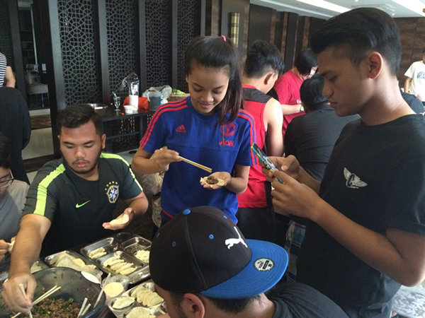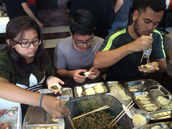 下午,分院的志愿者们早早地聚集来到餐厅开始着手准备。来自新加坡共22名师生来到活动地点,个个都兴奋不已,在一旁跃跃欲试。志愿者们一边指导着新加坡的交流生朋友如何包饺子,一边介绍关于“包饺子”的各种风俗。期间,轨道交通分院院长倪伟、分院团总支书记任杨老师也一起教来宾各式各样饺子的包法。在包饺子过程中,任杨老师更是亲自上阵指导,手把手交着新加坡交流生如何分饺子皮、包饺子等。每个程序都有条不紊,大家一边包饺子一边聊天,场面温馨十足。别出心裁的同学们还将水饺包成各种形状,有元宝状的、包子形的、方形的等等,花样不一的饺子更是为活动增添了一抹新奇色彩。在一旁还为大家提供了更具贵州特色的小吃“丝娃娃”任同学们自行挑选尝试。经过两个小时忙碌之后,大家终于品尝到了自己的劳动成果,交流生们一边品尝着自己亲手做的饺子,一边兴奋地用英语交谈着,有的人甚至一边咀嚼,一边闭起眼睛细细琢磨其中味道,那副认真的样子着实可爱,品完滋味,还不忘向他人示意“太好吃了!”。