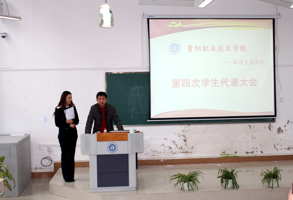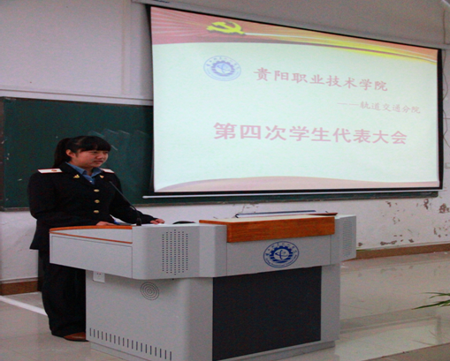 2013年12月12日下午13点整,贵阳职业技术学院轨道交通分院在教学楼5栋011教室召开第四次学生代表大会,会议由第三届学生会秘书长代慧敏主持。轨道交通分院副院长倪伟、轨道交通分院主任林亁志、轨道交通分院团总支书记陈永胜,更加邀请了院团委书记张炜、院团委办公室主任田天、学生处处长刘仕萍出席会议,并为大会的开幕致辞。本次大会代表应到145人,实到135人,未到10人。