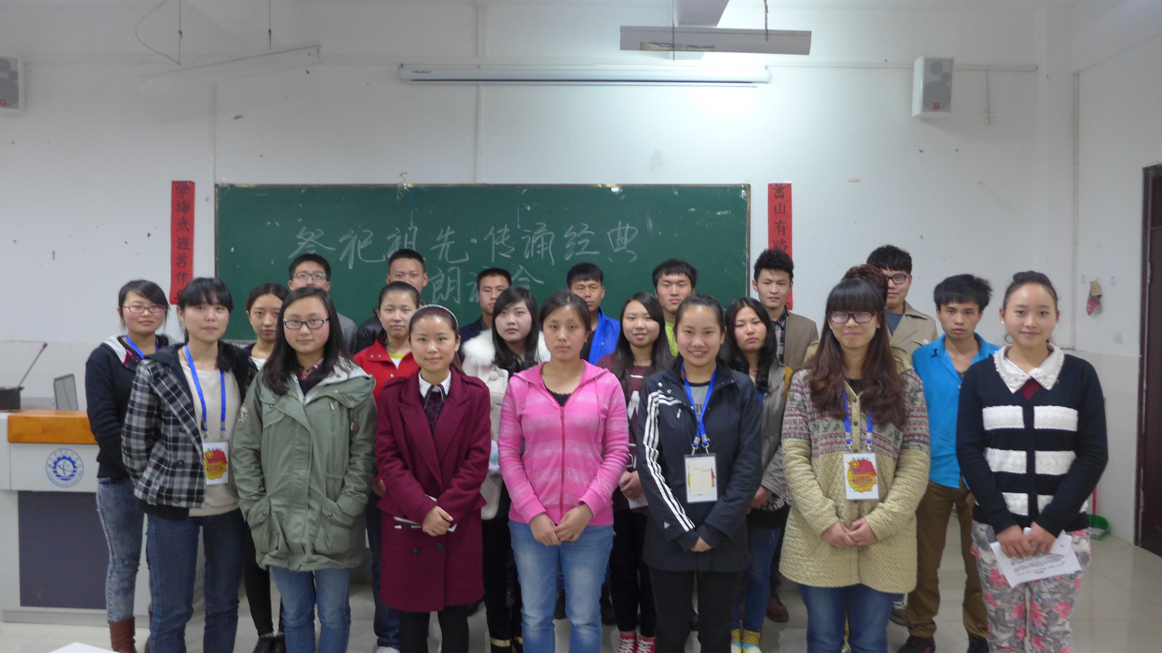 轨道交通分院团总支积极响应贵阳职业技术学院院团委下发的关于活动月相关内容精神,于2014年4月1日开展了“祭祀祖先·传诵经典”朗诵会预选比赛活动。轨道交通分院全体同学应团总支宣传部下发的文件指示,积极地参与这次活动,展现风采。清明节是我国的传统节日,在清明节到来之际,这次的活动让同学们更加地了解了清明节的传统,也清楚认识了我国对于逝去的先辈的尊重。