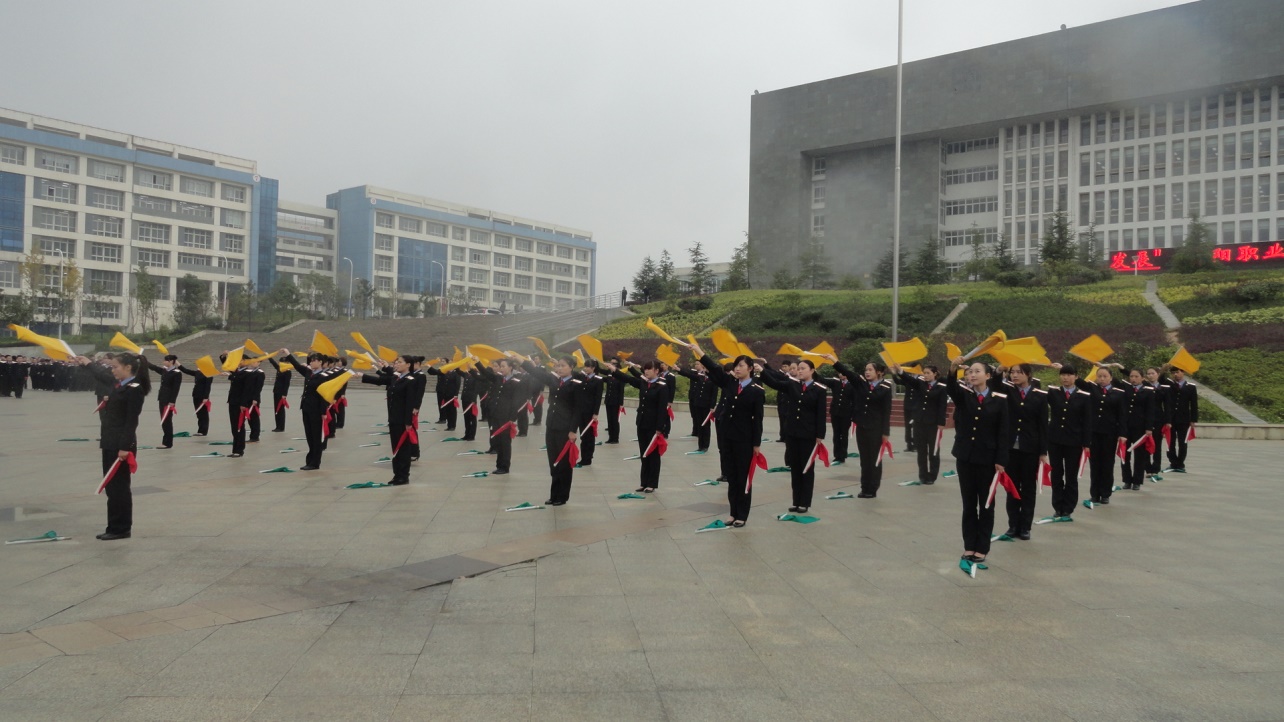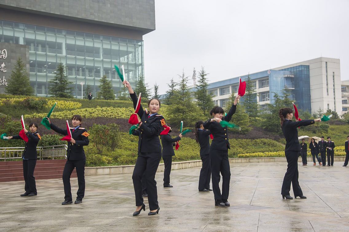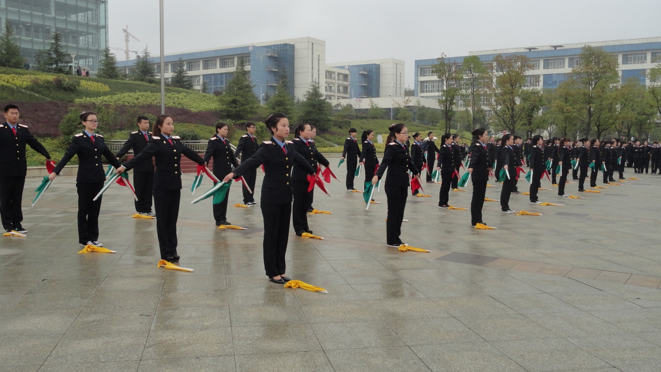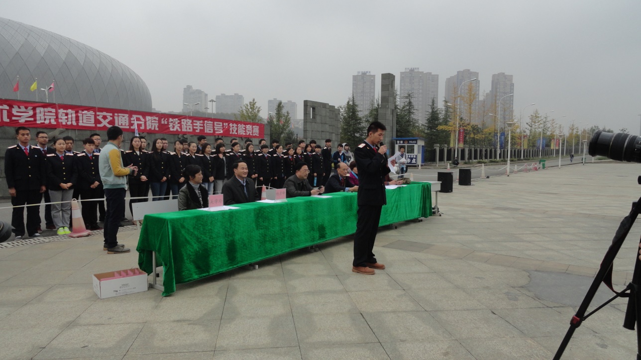 2014年11月6日下午,轨道交通分院2013级轨道交通运营管理专业5个班级的学生着整洁的铁路制服,手持信号旗,在学院升旗广场进行紧张又激烈的“铁路手信号操”竞赛。