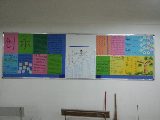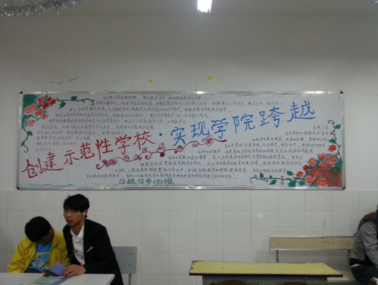 为了丰富我系同学的课余生活,我系在11月21日举行了以“创建示范学院 实现学院跨越”的黑板报大赛,在本次比赛中我系40个班级踊跃参加,内容积极向上,本次比赛也在11月23日圆满结束。