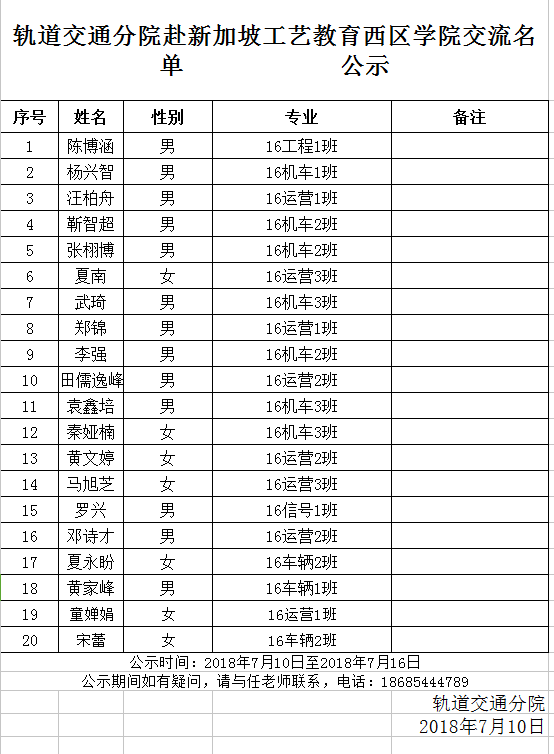轨道交通分院赴新加坡工艺教育西区学院交流名单公示