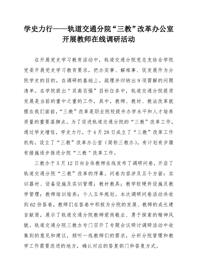 学史力行——轨道交通分院“三教”改革办公室开展教师在线调研活动