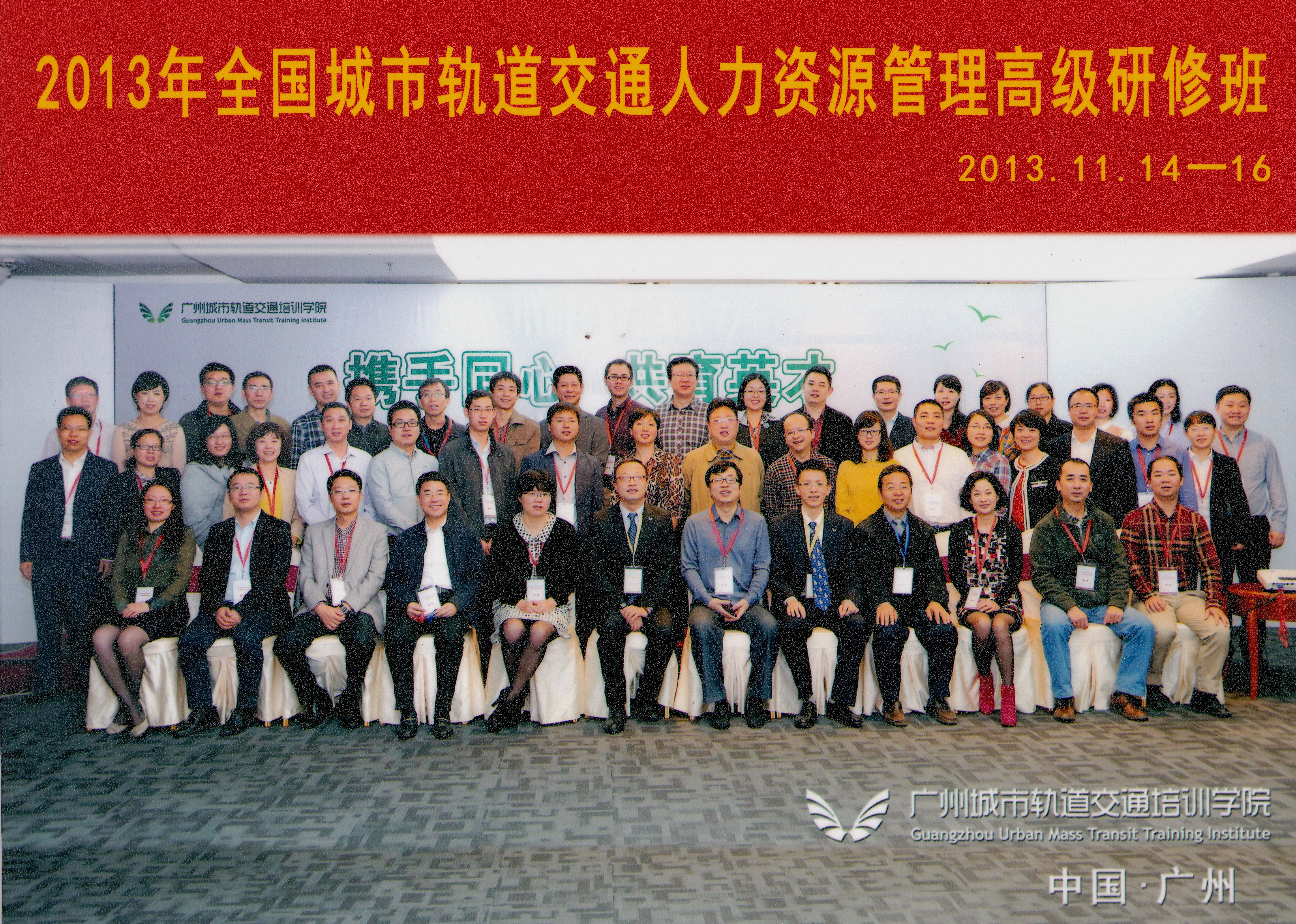 2013年11月14日至16日全国城市轨道交通人力资源管理高级研修班在广州城市轨道交通培训学院开班。来自北京、天津、上海、广州、重庆、贵阳、成都、南宁、长沙、杭州、宁波、福州、乌鲁木齐、武汉、石家庄、沈阳、无锡、东莞、南京等24家地铁的人力资源部的部长和管理人员参加了培训,聆听了专家的讲座,并相互交流了做法和体会,收到了很好的效果。贵阳职业技术学院轨道交通分院有幸也参加了培训。