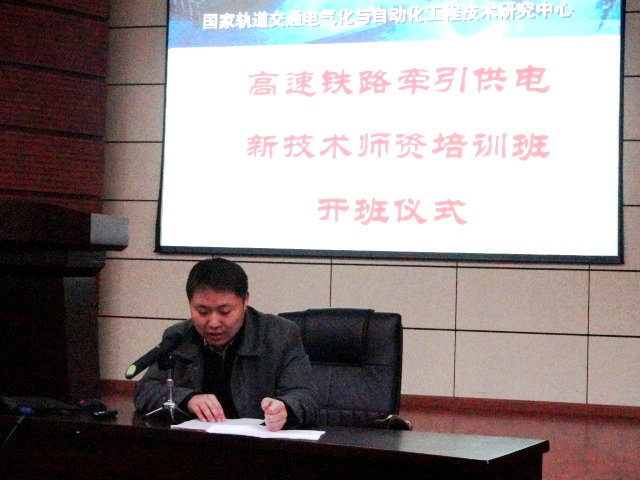 1月11日上午,师资培训班在西南交通大学牵引动力国家实验室举行开班典礼,中国工程院院士钱清泉教授为学员介绍高速铁路牵引供电技术概况。本次培训的主要内容有:AT供电方式及保护设置、整定计算;安全监控系统、综合接地系统和自动过分相技术;高速铁路接触网和受流保护;变电所综合自动化和微机保护。