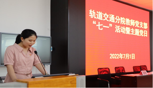 为庆祝中国共产党建党101周年,回顾党的历史,纪念党的生日,动员分院广大党员干部发挥战斗堡垒作用和先锋模范作用,轨道交通分院于2022年7月1日在学院高铁实训基地407教室召开庆祝中国共产党建党101周年暨“七·一”表彰大会。分院党总支书记刘仕屏、院长倪伟、党总支专职副书记王治强、副院长郁盛梅、王慧、方万鼎及分院全体党员教师参加本次会议。