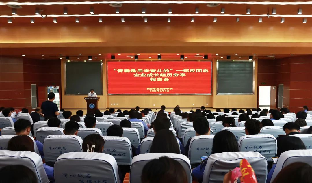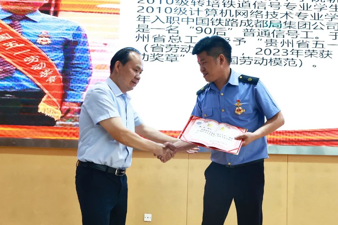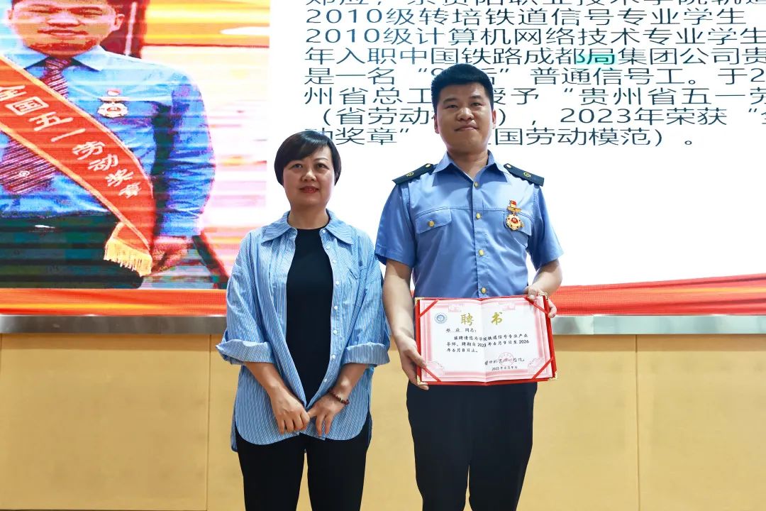 报告会上,贵阳职业技术学院院长刘雁向郑应同志颁发了《贵阳职业技术学院德育导师》聘书。同时,贵阳职业技术学院党委副书记段婉娇向郑应同志颁发了《贵阳职业技术学院产业导师》聘书。郑应同志以深厚的感情和朴素的话语,深刻诠释了“青春是用来奋斗的”丰富内涵。作为一名原毕业于贵阳职业技术学院轨道交通分院2010级铁道信号专业学生,郑应2013年入职从事电源屏维管工作。自入路以来,他始终坚定不移听党话、跟党走,埋头苦干,坚持改革创新,自觉把青春融入中国铁路事业,他用忠诚的品格、精湛的技术,为擦亮列车“眼睛”,为千万旅客高品质出行,提供幕后服务。由于工作突出、责任心强,他先后被评为中国铁路成都局集团有限公司劳动模范、全国铁道团委“向上向善好青年”等荣誉称号,2019年被贵州省总工会授予“贵州省五一劳动奖章”,2023年荣获“全国五一劳动奖章”。