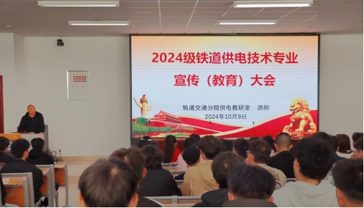 秋风轻抚,新页轻展,新学期悄然来临。为帮助2024级新同学们更好适应大学生活,激发同学们的学习热情,贵阳职业技术学院轨道交通分院铁道供电技术专业教研室于2024年10月9日在高铁实训中心407阶梯教室开展2024级铁道供电技术专业宣传(教育)大会。参会成员有铁道供电教研室全体教师、2024级铁道供电技术班级辅导员、及2024级全体学生(159名),大会由铁道供电专业教研室主任游刚主持并宣讲。