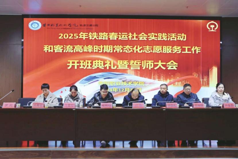 为积极响应中国铁路成都局集团有限公司加强校企合作、服务铁路春运、缓解客流高峰运输压力的需求,为青年学生提供社会实践的锻炼平台;2024年12月24日下午,在贵阳职业技术学院综合楼6-3阶梯教室,贵阳职业技术学院与中国铁路成都局集团有限公司贵阳客运段联合举办2025年铁路春运社会实践活动和客流高峰期常态化志愿服务工作开班典礼暨誓师大会。