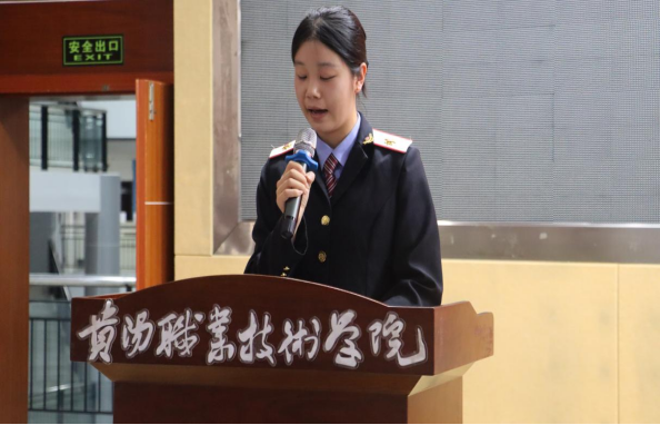 轨道交通分院学生志愿者代表王俊莎登台发言。她表达了全体志愿者珍惜实践机会、全力以赴做好服务工作的心声,承诺将以最饱满的热情、最专业的素养、最温暖的微笑,在暑运一线展现贵职学子的青春风采,为旅客平安、有序、温馨出行保驾护航。