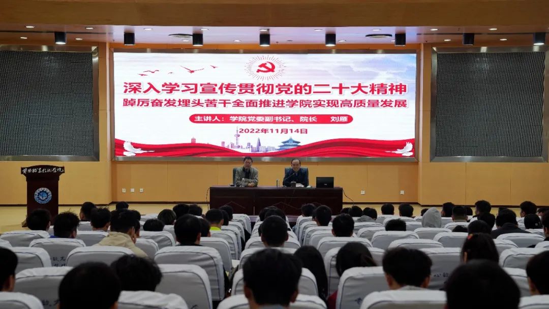 为扎实推动党的二十大精神在广大师生心中落地生根,进一步深入贯彻习近平总书记在学校思想政治理论课教师座谈会上的重要讲话精神,加强大学生思想政治工作,11月14日下午,学院党委副书记、院长刘雁在学术报告厅为装备制造分院2022级新生宣讲党的二十大精神,上了一堂生动的思政课。