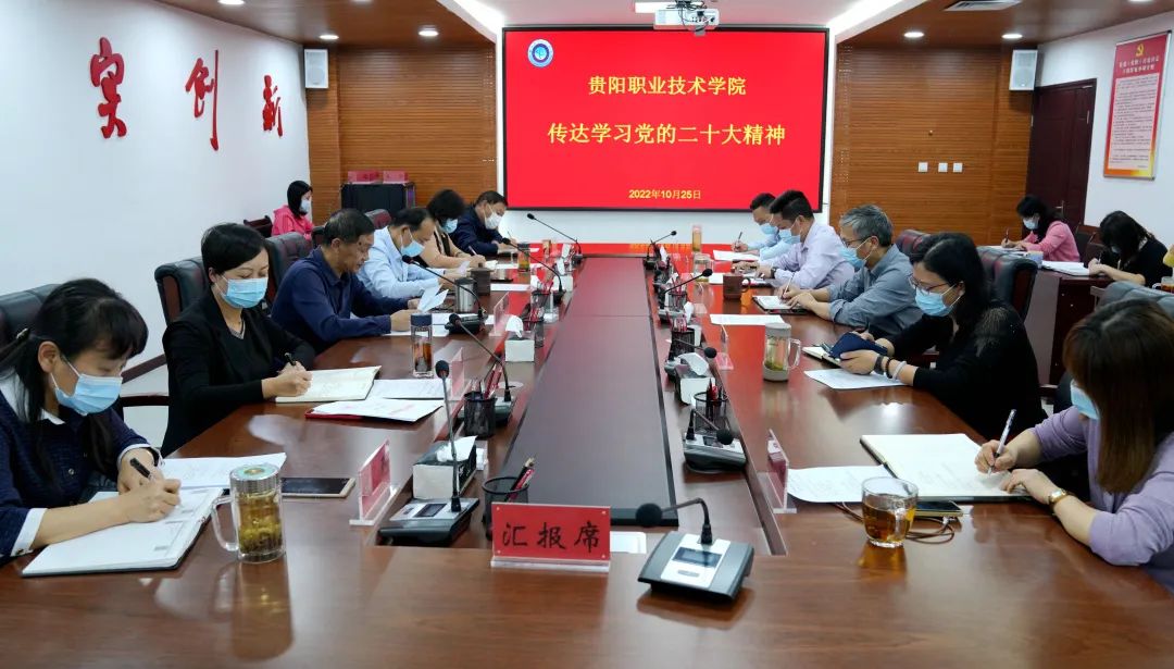 10月25日下午,贵阳职业技术学院召开党委会专题传达学习贯彻党的二十大精神。学院党委书记王廷志主持会议并传达学习党的二十大报告精神。党委副书记、院长刘雁传达学习了党的二十大精神。学院全体班子成员及学院各党总支、直属党支部书记,各部门、各分院(系)、校区负责人参加学习。