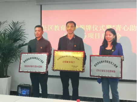 图1 生化工程系党总支书记龙丰、副书记马冀驰以及虹湖社区詹全书记共同揭牌