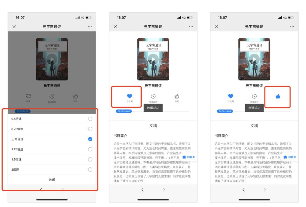 为了提升阅读效率,专注精彩内容,读者可选择倍速模式进行收听,同时也支持正对内容的收藏及点赞,推荐他人收听。