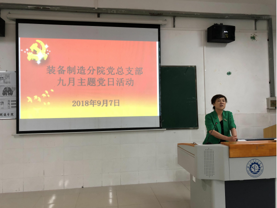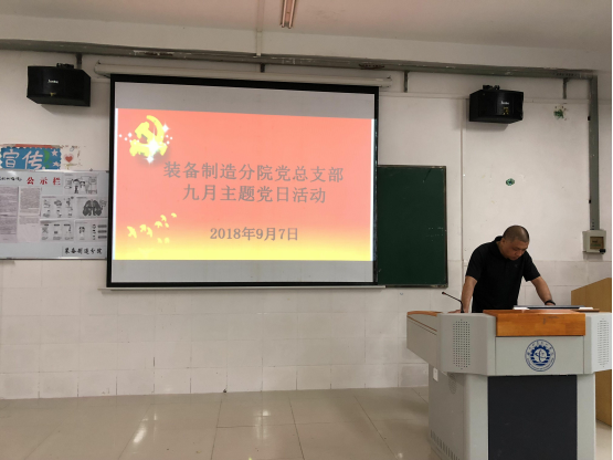 2018年9月7日中午12:40,装备制造分院党总支在4教203教室开展了九月主题党日活动,学院党委副书记、院长陈贵蜀同志和党委委员、副院长吴学玲同志、院法制办主任翁庆参加了本次活动,会议由分院党总支书记胡然同志主持。