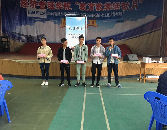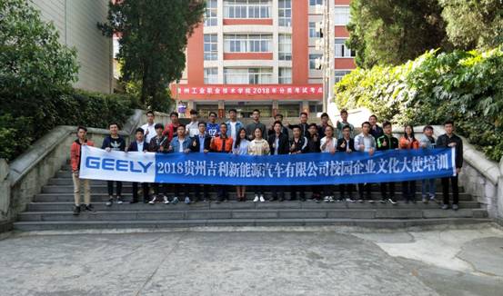 2018年4月17日,为推动校企融合,创新订单班培养模式,宣传吉利企业文化,增强学校师生企业认同感,培养一批企业文化大使,贵州吉利新能源汽车有限公司在贵州工业技术职业学院组织开展了“校园企业文化大使培训”。贵阳职业技术学院、贵州工业职业技术学院、贵州轻工职业技术学院、贵州装备制造职业学院、黔东南民族职业技术学院参加了此次培训。