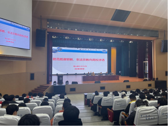 会上,观山湖公安分局李友中警官做《防范抵御邪教、非法宗教向高校渗透》安全教育主题讲座,李警官用身边的真实案例围绕意识形态安全给全体同学上了生动的一课。 通过学习教育,同学们认识到了邪教的本质,看清了非法宗教的危害,表示坚决抵制非法宗教,树立正确的世界观、人生观、价值观,成为政治上合格的社会主义公民。