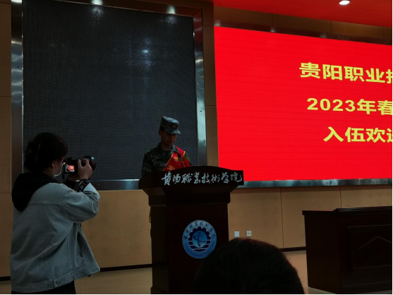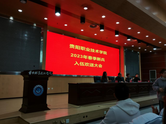 2023年3月16日学院组织召开2023年春季欢送新兵入伍大会,分院征兵领导小组成员单位负责人、征兵专员、21级学生代表参加。