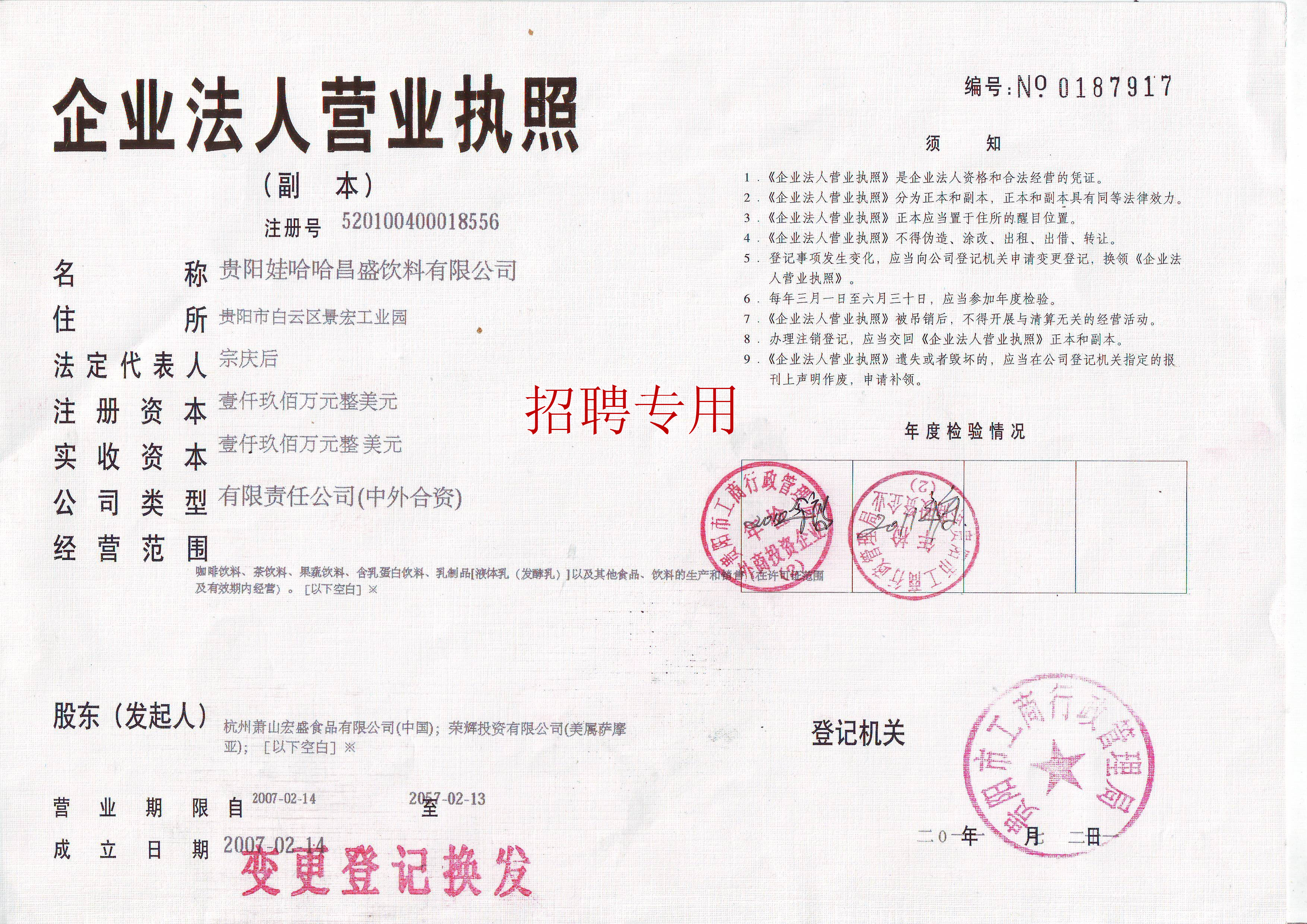单位简介:娃哈哈贵阳生产基地是杭州娃哈哈集团有限公司下属合资企业,主要生产娃哈哈系列产品。杭州娃哈哈集团有限公司创建于1987年,为目前中国最大的食品饮料生产企业,在全国26个省市建有100余家合资控股、参股公司,在全国除台湾外的所有省、自治区、直辖市均建立了销售分支机构,拥有员工近2万名,总资产达121亿元。娃哈哈贵阳分公司位于贵阳市白云经济技术开发区景宏工业园,一、二期、三期总投资4600万美元,占地面积113亩,设备主要从德国、意大利、瑞士等地引进。现贵阳公司2013年拟投资2000万美元建设四期项目,占地31.5亩,因发展需要,面向社会诚聘以下人员,欢迎有识之士加入我们的行列!